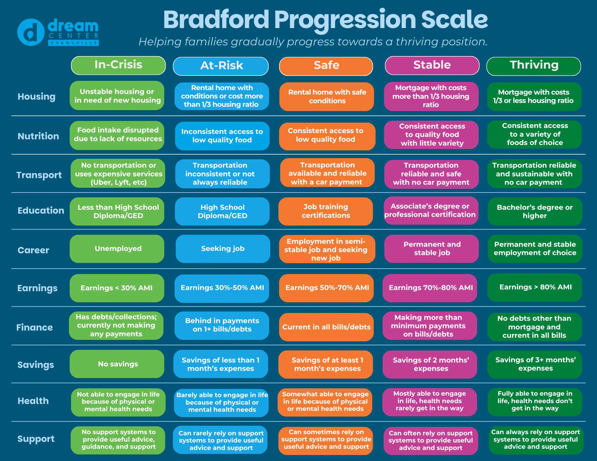The Economic Mobility Specialist’s role is to evaluate the economic standing of the families we serve. An in-house progression scale, the Bradford Progression Scale, is used to determine this standing. The results of the scale provide a clear picture of the family’s needs and categorize them into one of five categories. From here, families work with our team to create goals.